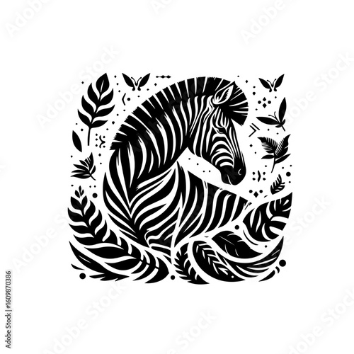 zebra, animal, wildlife, africa, safari, nature, stripes, black, white, graphic, illustration, design, pattern, art, stylised, modern, simple, clean, silhouette, icon, symbol, head, mane, face, portrait, wild, mammal, equine, creature, fauna, organic, botanical, leaf, foliage, flora, decorative, ornamental, abstract, minimalist, creative, unique, artistic, graphic design, vector, isolated, white background, bold, striking, elegant