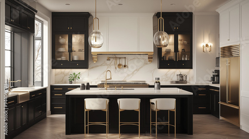 Stylowa kuchnia współczesna z czarnymi i białymi szafkami, które tworzą nowoczesny, elegancki wygląd. Złote wykończenia, takie jak uchwyty i akcesoria, dodają ciepłego blasku i luksusowego akcentu.