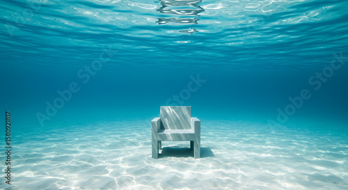 ocean, water, underwater, chair, seat, furniture, submerged, sand, ocean floor, sunlight, light, ray, blue, turquoise, clear, calm, tranquil, peaceful, serene, quiet, still, depth, bottom, marin, aquatic, coral, reef, beach, coast, sea, solitude, lonely, isolated, mysterious, enigma, puzzle, mystery, surface, ripple, wave, stillness, underwater photography, marine life, shallow, crystal, relax