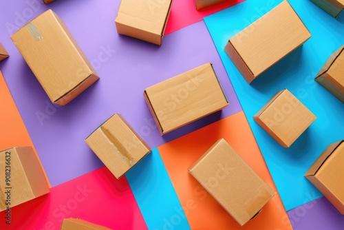Subscription Boxes. Advertising Business with Blank Cardboard Cargo on Colorful Background
