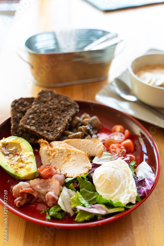 Substantial breakfast with avocado and nuts, rye toasts, vegetables, fried bacon, chicken and poached egg