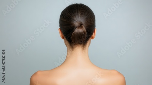 back, view, slender, body, posture, symmetry, close, shot, low, resolution, portrait, elegance, beauty, simplicity, human, skin, hair, style, wellness, calm, minimalism, aesthetic, calmness, relaxation, softness, natural, sharpened, texture, light, tone, form, health, female, sex, appearance, fashion, presentation, visual, artistry, minimalist, photo, feature, neck, shoulder, line, curve