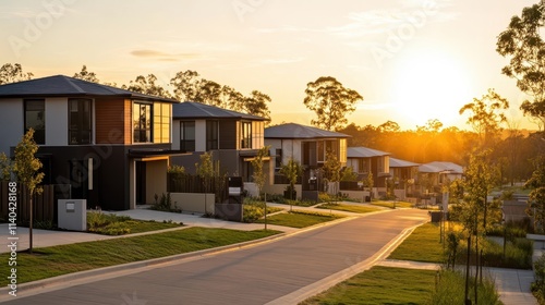 housing, suburb, architecture, neighbourhood, residential, home, building, street, tree, landscape, dawn, sunrise, grass, outdoors, nature, road, sky, city, community, environment, scenic, modern, design, real estate, urban, estate, development, property