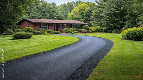 driveway, home, landscaping, suburban, tree, lawn, garden, house, nature, exterior, property, residential, asphalt, paved, suppressing, grass, plant, maintenance, design, front, yard, view, summer, beautiful, charming, well-kept, real estate, estate, improvement, construction, paving, new, investment