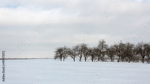 Suburbs of Grodno. Belarus. Winter landscape outside the city. A row of trees in a snowy open field against a light winter sky..