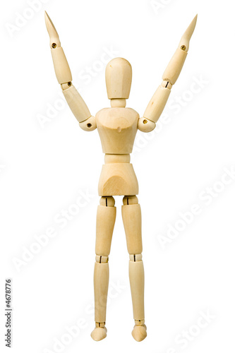 success, cheering, joy, encouragement, winning, hands up, happy, happiness, exercise, stretch, art, body, concept, doll, dummy, figure, human, man, robbery, surrender, mannequin, model, position, wood, wooden, object, isolated, white background, clipping path, cut-out