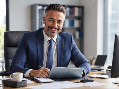 businessman, business, computer, office, laptop, desk, working, people, work, person, manager, table, man, sitting, notebook, writing, men at work, executive, suit, photogenic, boss, 1, professional, smile, job