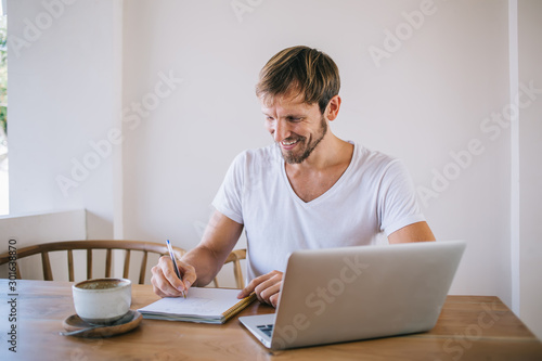 Successful male copywriter writing information for interesting article publication working remotely in public coffee shop with internet connection for laptop device, happy man making notes indoors
