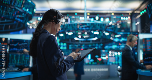 Successful Stock Exchange Manager Wearing Headphones, Working in Modern Office. Proactive Female Trader Browsing Financial Reports on a Tablet Computer, Using Software with Stock Market Auctions