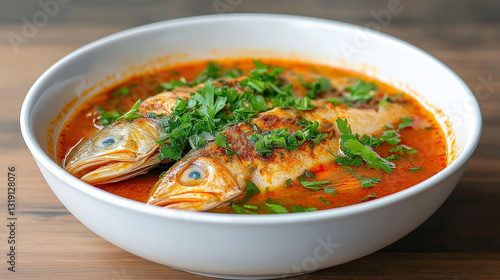Succulent cooked fish swimming in fiery red broth, sprinkled with verdant parsley, nestled within pristine ceramic bowl