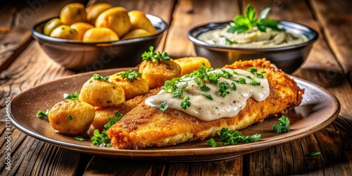 potato, bokeh, food photography, receipe, dinner, seafood, fish, crispy, creamy, delicious, eatery, home cooking, meal, food, gold, rustic, wooden table, blurred background, comfort food, appetising, tasty, epicure, culinary, gastronomy, photo, image, detail, texture, plate, dish, serving, eating, epicure