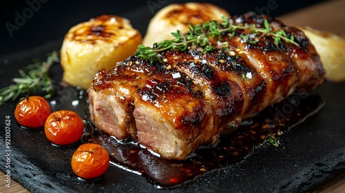 Succulent Roasted Suckling Pig Dish Presented on Elegant Black Stone Plate