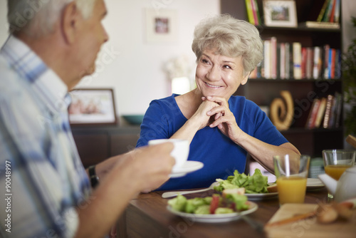 senior, couple, marriage, breakfast, meal, eating, drinking, sitting, dining room, looking, smiling, vitality, aging process, toothy smile, happiness, talking, conversation, home interior, healthy eating, grey hair, listening, short hair, togetherness, grandparent, eyewear, resting, relaxation, morning, table, maturity, domestic life