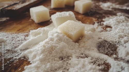 Sugar Cubes and Granulated Sugar on Rustic Wooden Surface