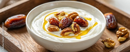 Suhoor Meal Concept. Delicious yogurt topped with nuts and dates in a wooden bowl