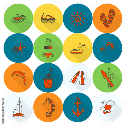 summer, beach, travel, vacation, icon, vector, symbol, sea, tour tourism, holiday, signs, cruise, ocean, flat, design, style, element, season, anchor, flip-flop, pail, shovel, sunglasses, sun, cap, starfish, shell, swimwear, beach chair, chaise longue, sunbathe, cocktail, ice cream, diving, sunburn, cream, lifebuoy, rubber, ring, flipper, fur seal, palma, surfboard, nautilus, sailfish, dolphin, island