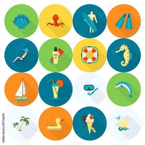 summer, beach, travel, vacation, icon, vector, symbol, sea, tour tourism, holiday, signs, cruise, ocean, flat, design, style, element, season, anchor, flip-flop, pail, shovel, sunglasses, sun, cap, starfish, shell, swimwear, beach chair, chaise longue, sunbathe, cocktail, ice cream, diving, sunburn, cream, lifebuoy, rubber, ring, flipper, fur seal, palma, surfboard, nautilus, sailfish, dolphin, island