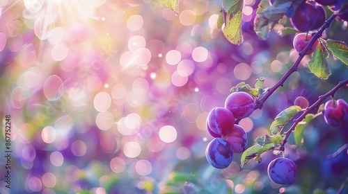Summer background. Blurred plum orchard and a plum tree with ripe purple plums on branches in focus, shimmering in rich violet hues.