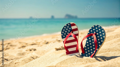 flip-flop, beach, summer, sand, ocean, sea, vacation, holiday, travel, relaxation, coastal, shore, water, blue, white, red, stripes, star, patriotic, american flag, footwear, foot, sunny, daytime, leisure