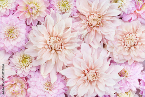 Summer blossoming delicate dahlias, blooming flowers festive background, pastel and soft bouquet floral card, selective focus, toned