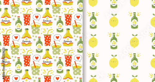 Summer bottled lemonade, cute lemon character, juice splashes, speech bubbles. Set of vector seamless patterns.