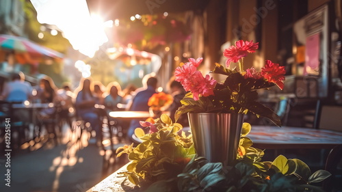 summer city street cafe in Europe ,Italy,Spain,Greece and Baltic Countryes ,medieval town ,people walk,day and evening life ,candles blurred light,cup of coffee on Table,style,generated ai