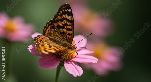 Summer Garden Butterfly on Pink Flower - A beautiful butterfly with intricate wings delicately rests on a vibrant pink flower, symbolizing nature's beauty, tranquility, transformation, ephemerality