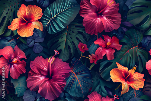 flower, pattern, floral, vector, seamless, hibiscus, nature, illustration, design, summer, spring, art, pink, decoration, beauty, vintage, blossom, leaf, wallpaper, plant, flora, tropical, colours, texture