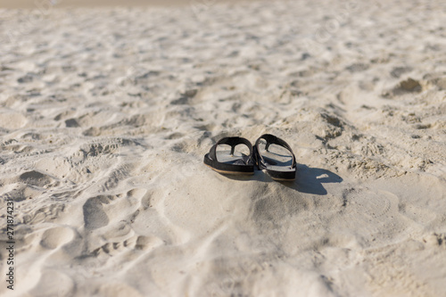 Summer holiday concept. Black pair of sandals on beach.