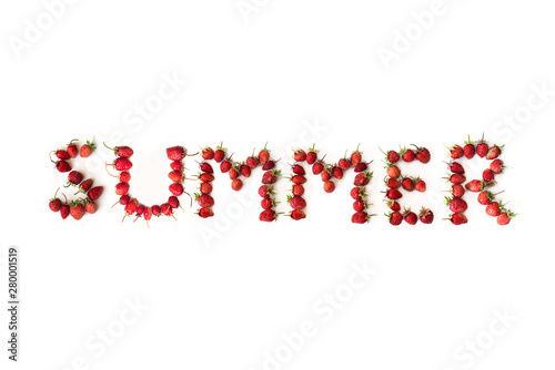 Summer inscription, lined from strawberries on a white background, top view. pattern.