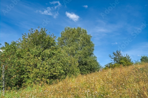 Summer landscape green meadow on a background of forest and cloudy sky.
