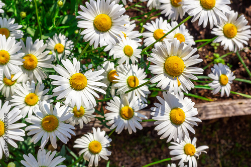 Summer landscape with field of camomiles at sunny day. Camomile daisy flowers, wild flowers for the cover, banner, post card. Homeopathic plant, medicine herb.