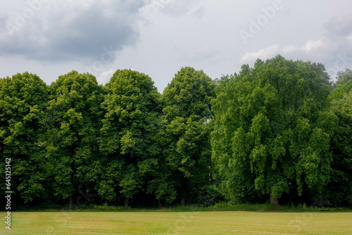 Summer landscape with view of green grass meadow and big trees under white grey cloudy sky as background, Amsterdamse Bos (Forest) A park in the municipalities of Amstelveen and Amsterdam, Netherlands