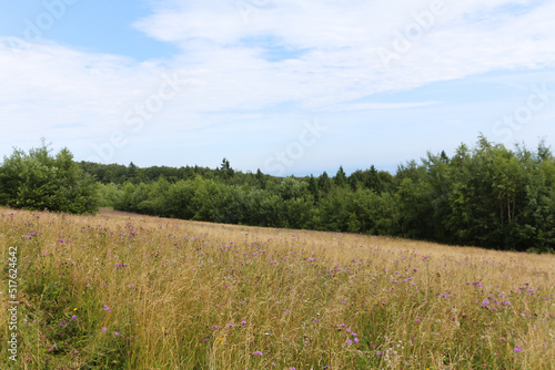 Summer mountain landscape. Green meadow with wildflowers near the forest. Carpathian Mountines, Ukraine, Eastern Europe.