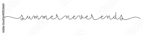 SUMMER NEVER ENDS black vector monoline calligraphy banner with swashes on white background