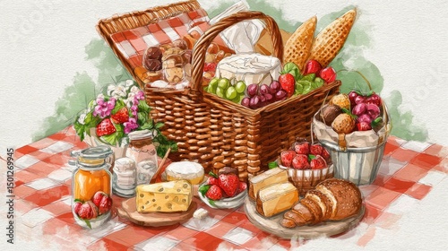 picnic, food, summer, outdoors, cheese, bread, fruit, grape, strawberry, blanket, wicker basket, illustration, watercolor, still life, lunch, nature, healthy, fresh, epicure, delicious, countryside, romance, relaxing, vacation, holiday, chequered, tablecloth, garden, park, lifestyle, travel, celebration, dessert, artisan, natural, rustic, gourmet food, snack, brie, baguette