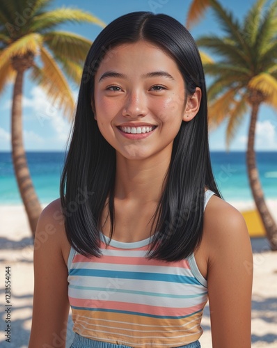summer, portrait, asian, teenage, happy, straight, black, hair, tank, top, short, sunny, beach, background, woman, smiling, smile, beauty, people, sea, face, children, outdoors, person, joy, happiness, water, model, ocean, fashion, sky, lifestyle, fun, vacation, lady
