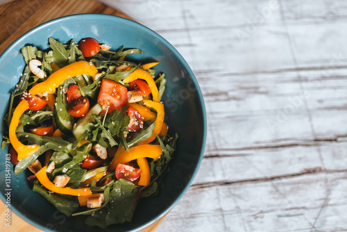 cooking, cookery, salad, food, fresh, healthy, meal, plate, delicious, dish, epicure, nourishment, table, wooden, tasty, traditional, dining, eat, lunch, nobody, rocket, arugula, green, closeup, sauce, gastronomy, menu, chopping board, receipe, domestic, serving, starter, diet, organic, tomatoes, yellow, sweet pepper, red, vegetarian, colours, detox