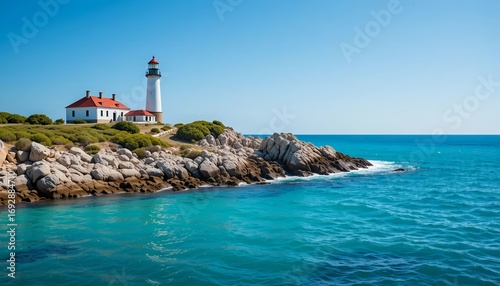 Summer scene with lighthouse on rocky shore, clear blue sky, turquoise water, very sharp landscape photography.