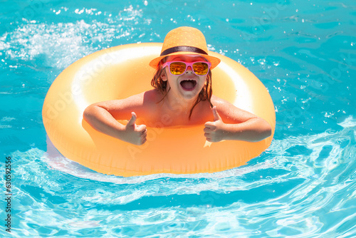 Summer travelling. Child boy in swimming pool with inflatable ring. Kids swim in water pool on summer vacation. Swim for child on float. Beach sea and water fun.