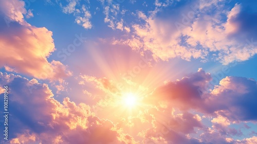 Summer twilight sky featuring clouds and light flare from the sun with ample copy space
