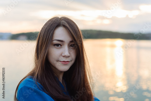 summer vacation happy portrait beautiful woman girl caucasian asian blended in blue shirt posing on background sky lake water sunset long hair brunette outdoors