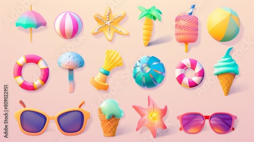 Summer Vibes Icon Pack, A set of vibrant close-up summer icons such as sunglasses, beach balls, ice cream cones, and fireworks, all easily adjustable for different design needs