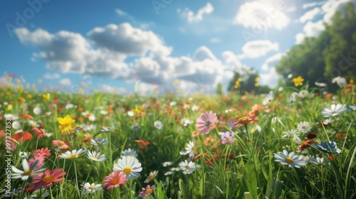 wildflower, field, summer, flower, blue skies, cloud, greengrass, nature, beauty, sunshine, daisy, blooming, colourful, vibrant, outdoors, meadow, landscape, flora, floral, flower, spring, daisy, grass, yellow, sky, plant, blossom, garden, chamomile, chamomile, white, blue, bloom, wild, season