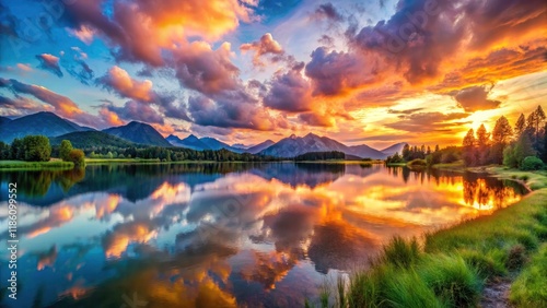 Summer's fiery sunset ignites a stunning panorama; colorful clouds embrace a lake, mountains, and river's reflection.