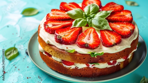 summery strawberry and basil cake, fresh and light, presented on a cool aqua background