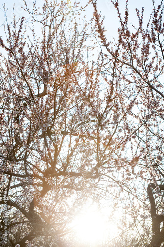 Sun behind the blooming apricot