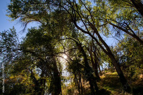 tree, forest, sky, nature, tree, green, pine, blue, leaf, spring, landscape, wood, leaf, branch, sun, autumn, tree branch, tall, sunlight, summer, park, up, natural, plant
