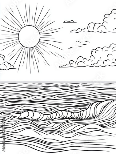 sun, ocean, wave, sea, sky, cloud, water, beach, sunbeam, ray, horizon, coastal, landscape, nature, summer, day, bright, light, calm, peaceful, tranquil, serene, blue, white, drawing, illustration, line, art, graphic, design, pattern, texture, abstract, style, monochrome, black, simple, elegant, aesthetic, beauty, scene