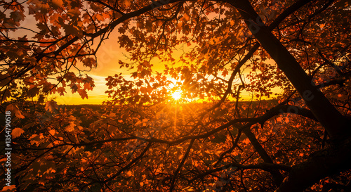 Sun Shining Through Autumn Leaves Creating a Golden Landscape View